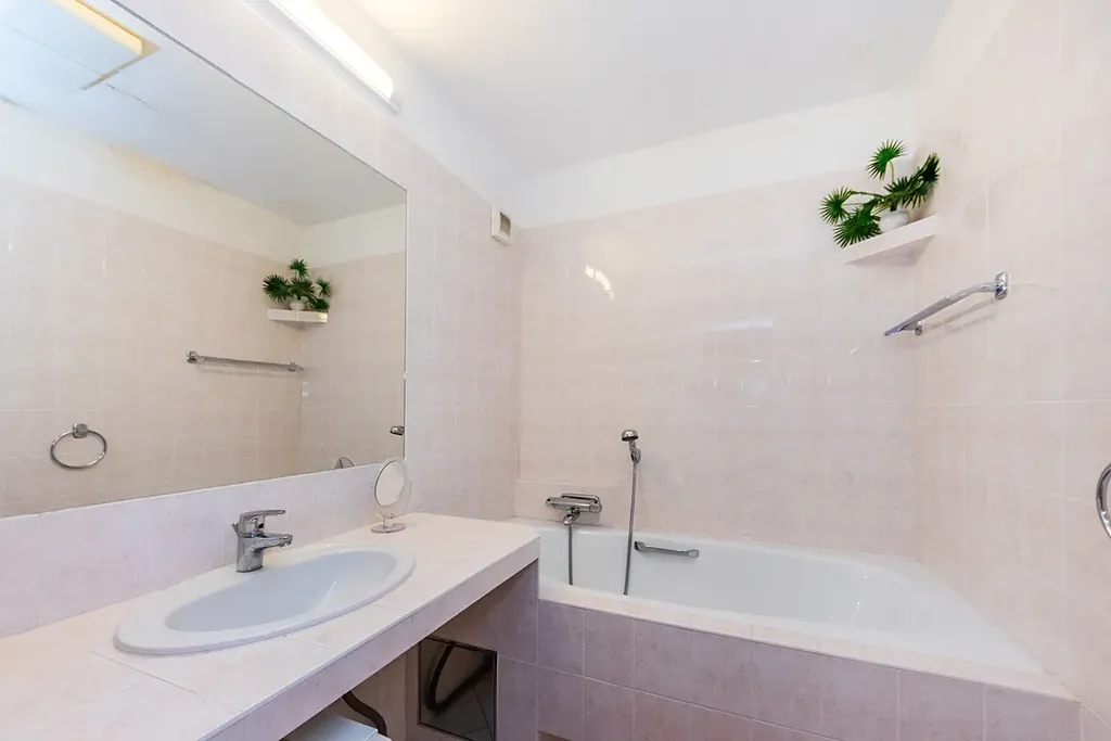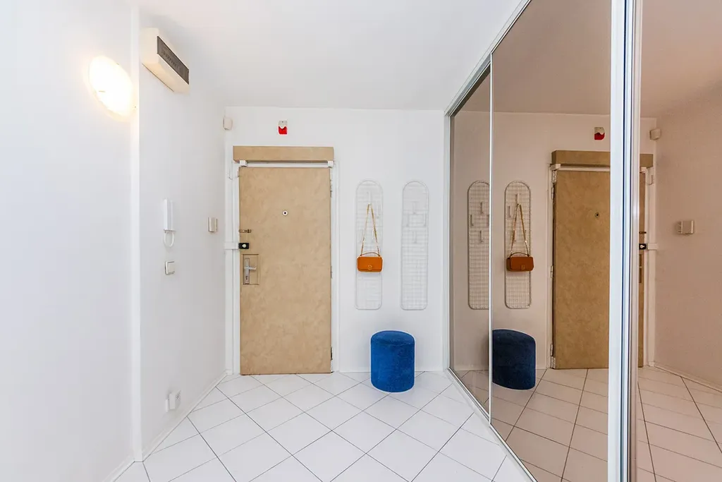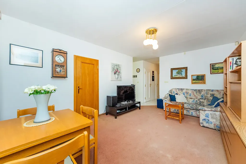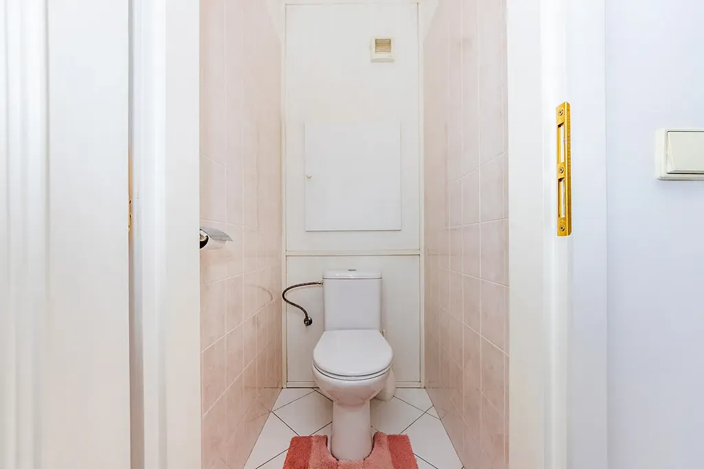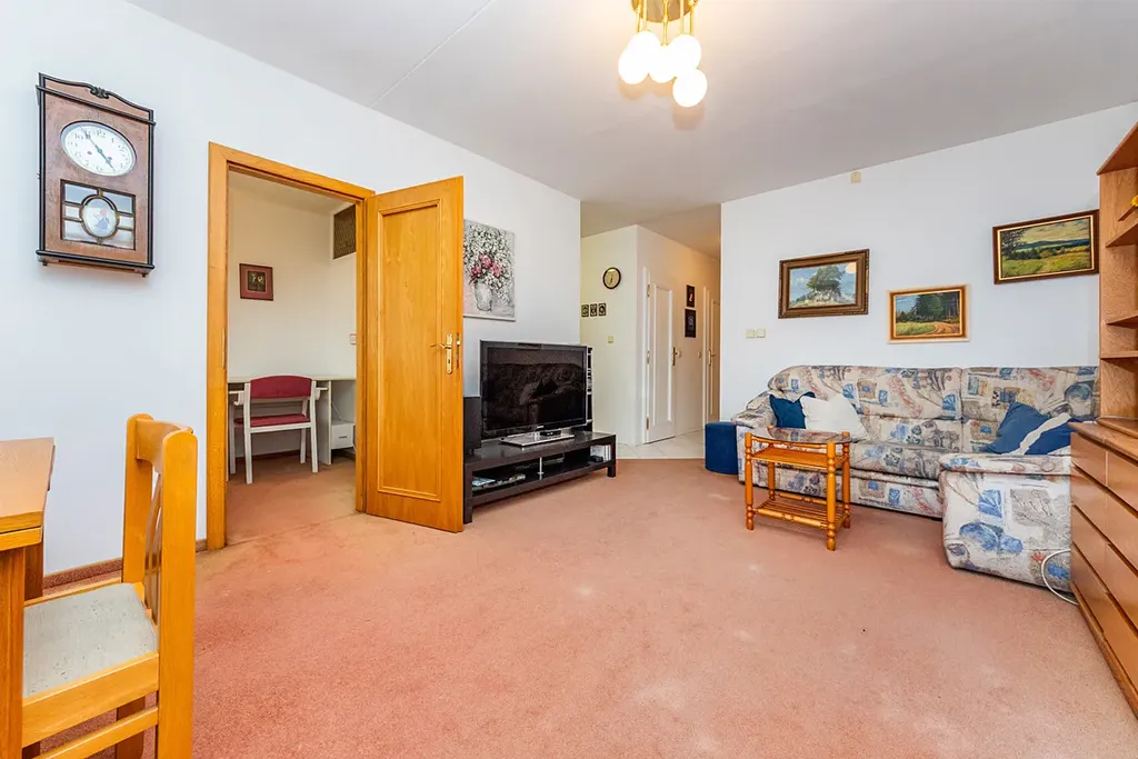 Koupelna s vanou a toaleta jsou oddělené, zděné. V prostorné chodbě je veliká vestavná šatní skříň. Původní kuchyň je rozdělena příčkou s posuvnými dveřmi na kuchyňský kout a malou ložnici, která má vchod i z obývacího pokoje.