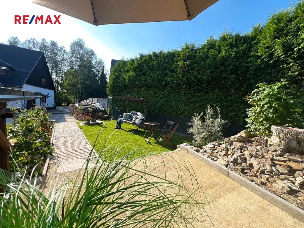 Vlastní příjezdovou cestou po průjezdu plně automatickými vraty se dostanete na zpevněné parkoviště za domem. Brána má i samostatné ovládání pro ubytované hosty. Prostorná zahrada vybízí k posezení u krbu pod dřevěnou pergolou, nebo novému využití dle přiložené vizualizace. Vaše hosty jistě příjemně překvapí krytý venkovní bazén o velikosti 18 m2 s integrovaným tepelným čerpadlem.