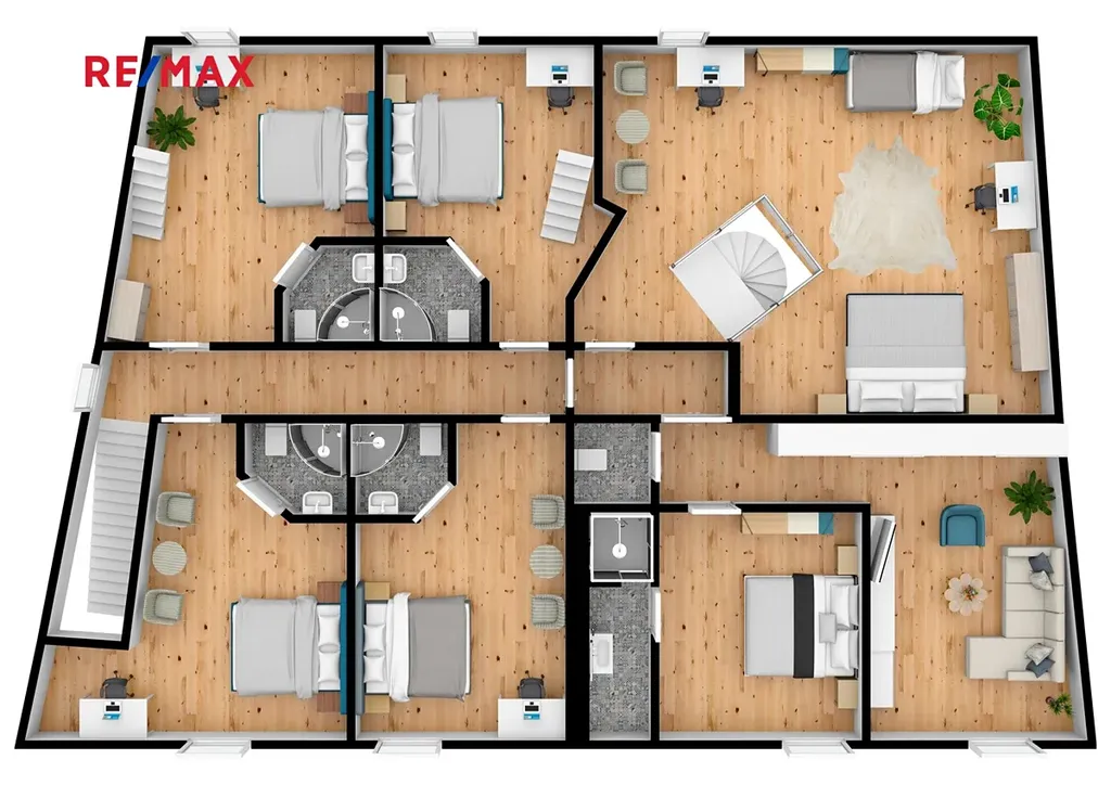 Z hlavního obývacího pokoje se dubovým točitým schodištěm dostaneme do 1. patra, které čítá celkem šest pokojů o různé velikosti a možnostmi využití. Všechny pokoje mají samostatný vchod, vlastní vybavení, ledničku, televizi, sprchový kout a sociální zařízení.
