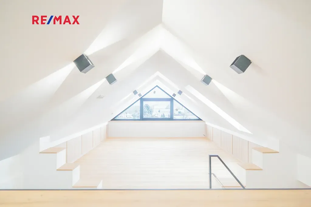 V horním patře se nachází velkoryse řešená ložnice s pracovnou, jejímž největším benefitem je opravdu unikátní panoramatický výhled do krajiny. Jde o prostor, který nabízí dokonalé zázemí pro odpočinek i práci z domu — inspirace je tady doslova na dosah ruky.