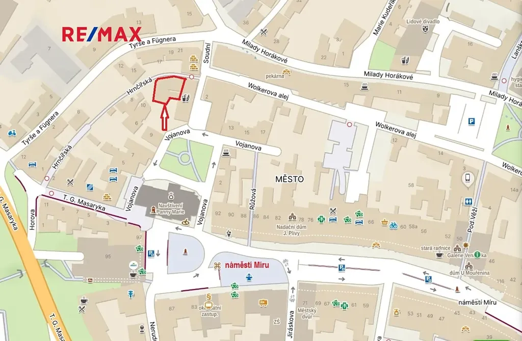 Výhoda objektu je umístnění přímo v centru města těsně pod náměstím.