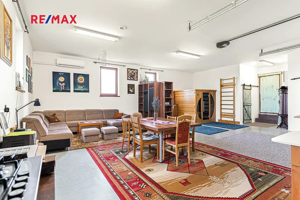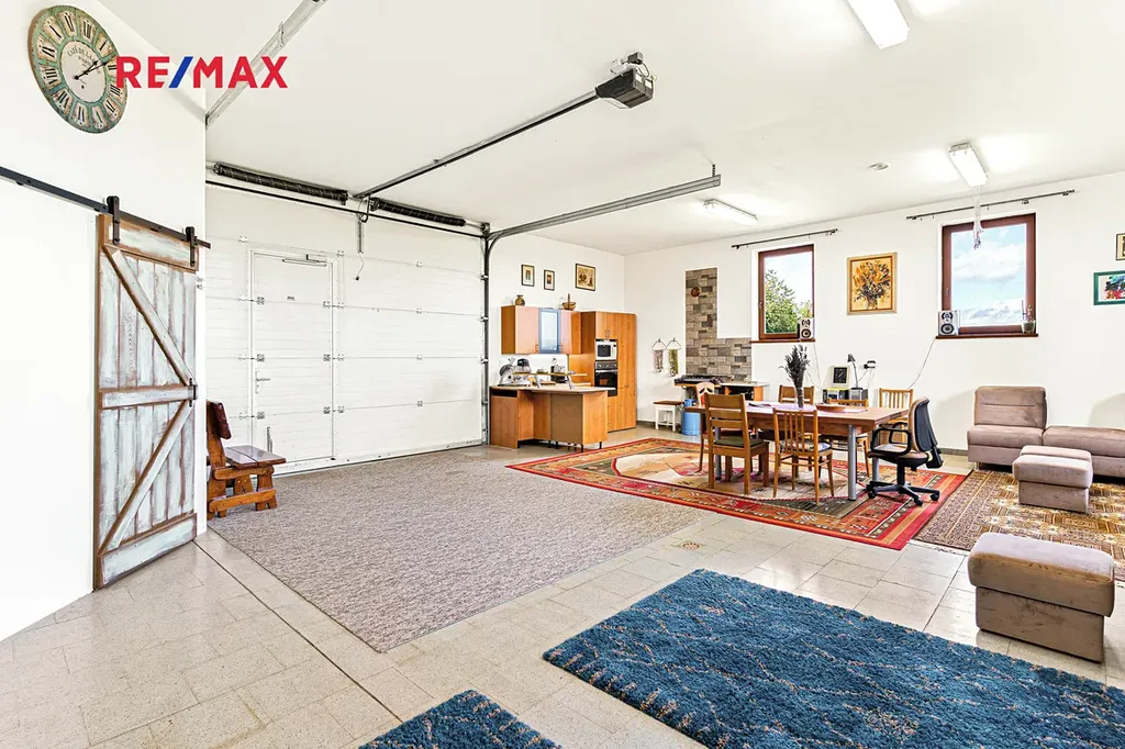 V druhé části domu je pro milovníky prostoru velká víceúčelová místnost s širokým využitím (garáž, dílna, posilovna, sklad, herna, studio, ...). Nyní se zde nachází sauna, dále vestavěná místnost jako sklad či sklípek potravin a místnost s technologiemi pro dům (tepelné čerpadlo, zásobník pitné vody, vodárna) a sprchový kout, WC, pračka, sušička, kuchyňský kout s myčkou.