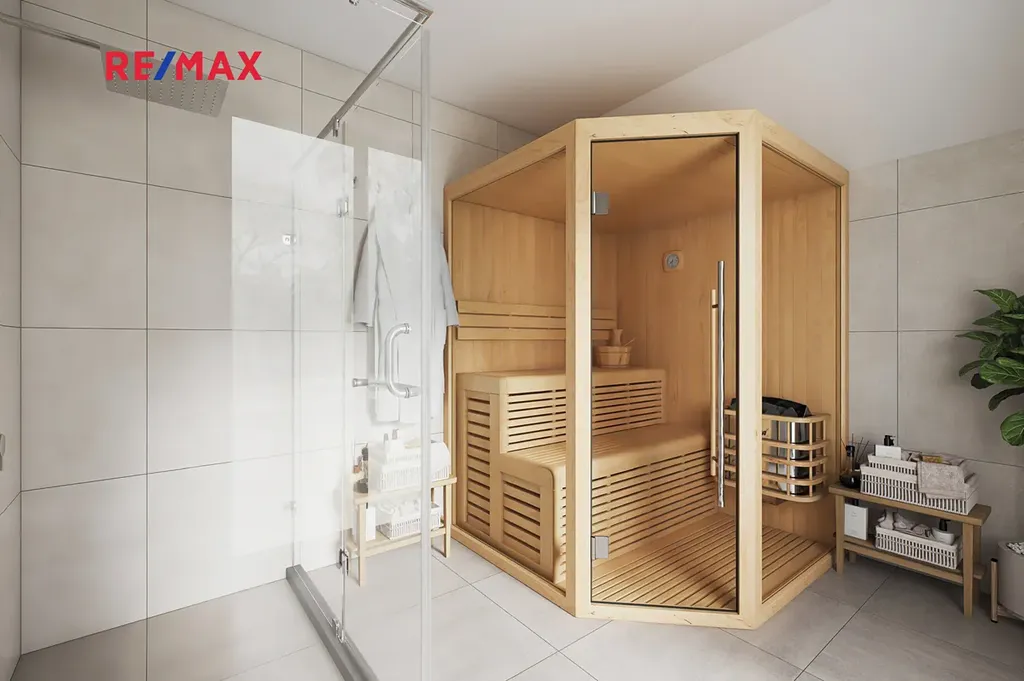 Po náročném dni si dopřejte odpočinek na terase a ponořte do venkovní vířivky Wave o rozměru 220 x 220 cm. V chadných nebo mrazivých dnech Vás velmi potěší pobyt ve vnitřní finské sauně Marimex. Terasa o rozloze 44 m² ve druhém patře navíc nabízí dostatek prostoru pro venkovní kuchyň, posezení nebo relaxační lehátka. Pro lehké sportovní vyžití a volný čas je k dispozici okrasná zahrada s bazénem.