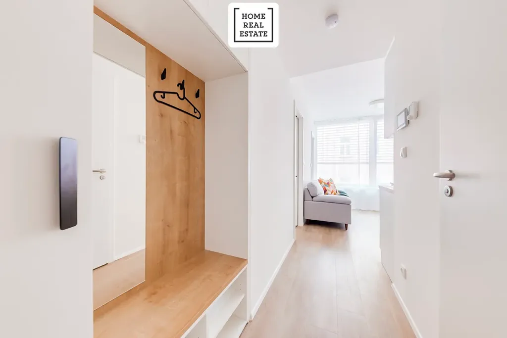 Dispozice bytu zahrnuje obývací pokoj s plně vybaveným kuchyňským koutem (sklokeramická varná deska, digestoř, trouba, myčka, lednice a mikrovlnná trouba), samostatnou ložnici, koupelnu se sprchovým koutem, WC, umyvadlem a pračkou se sušičkou a vstupní předsíň. Interiér je zařízen kvalitním nábytkem na míru. Součástí nabídky je také sklepní kóje, která poskytuje další úložný prostor.
