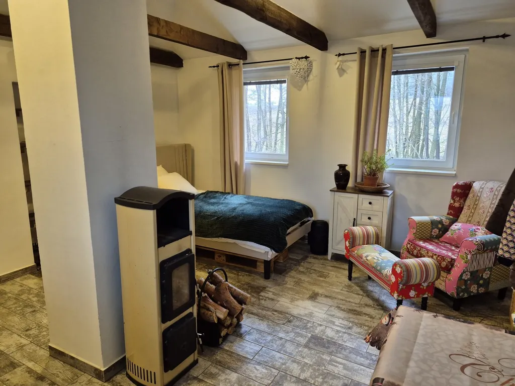 Při vstupu do chaty vkročíme do chodbičky, kde po levé straně je WC a sprchový kout. Ohřevem vody je bojler Dražice 50l. Na pravé straně je obytný prostor s kuchyňským koutem. Na podlaze je dlažba, okna jsou plastová. Elektřina 230V a 400V. Náklady jsou ročně 700,-Kč za směsný odpad + sběrný dvůr, zálohy na elektřinu cca 1.500,-Kč. Nemovitost není zatížena zástavním právem.