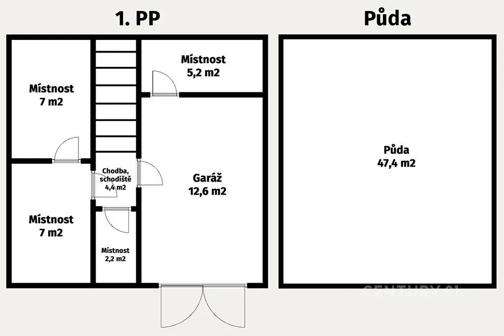 Suterén (1. PP): Plné podsklepení zahrnující garáž (12,6 m²) a technické místnosti, sklady a kotelnu na tuhá paliva (celkem cca 21 m²).