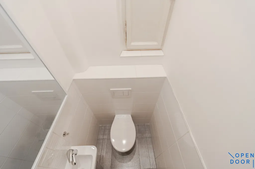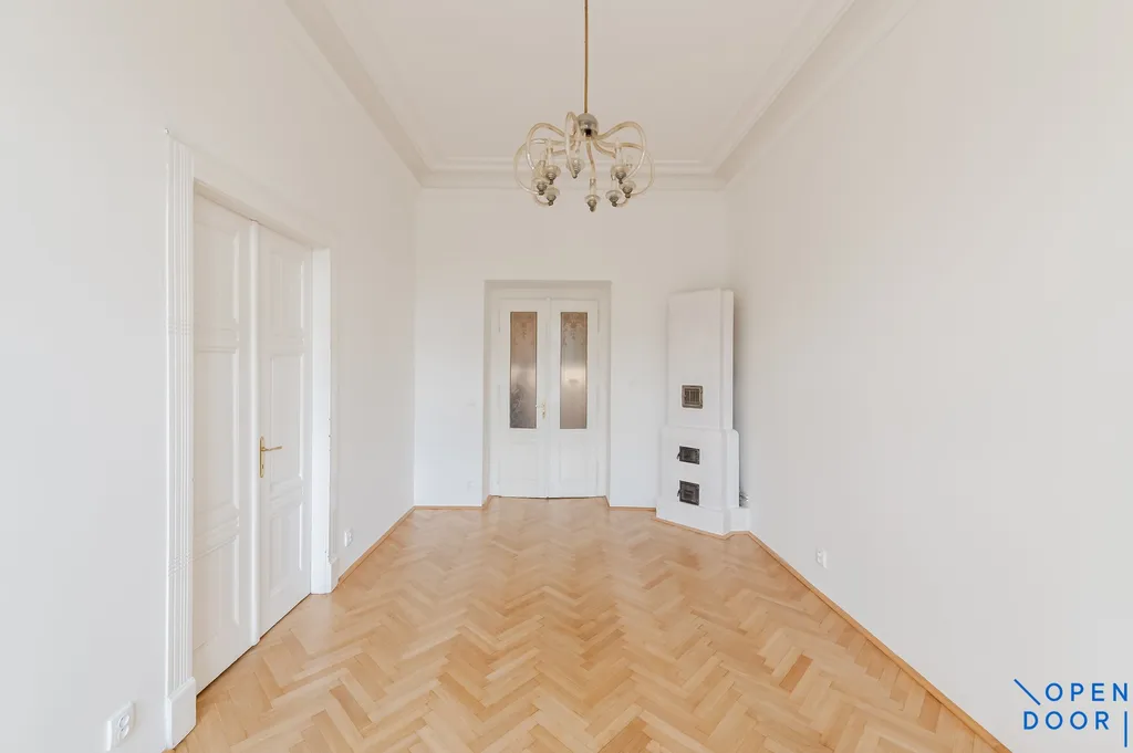 Byt je situován napříč domem, z prostorné vstupní haly je po pravé straně vstup do dvou velkých reprezentativních pokojů směřujících k Vltavě. Větší navazuje na zimní zahradu a je z něj možné vstoupit na malý balkon. Druhý z pokojů je přístupný i z kuchyně. Oba pokoje je možné propojit dvoukřídlými dveřmi. Pohled z oken na Vltavu se Žofínem, budovu Mánesa, Tančící dům a Národní divadlo je krásný. Protilehlá ložnice směřuje do klidného vnitrobloku, má vlastní šatnu a navazuje na velkou koupelnu vybavenou vanou, sprchovým koutem a toaletou. Za chladných dnů je možné využívat elektrické podlahové topení a topný žebřík. Z předsíně vlevo od vchodu do bytu je přístupné druhé samostatné WC a technická místnost s novým kombinovaným plynovým kotlem pro topení a ohřev vody v bytě, je v ní i přípojka na pračku. Z haly je také druhý vchod do kuchyně. Před třemi lety prošel byt částečnou rekonstrukcí (nové topení, rozvody elektřiny a vody, nová kuchyň), s důrazem na zachování některých původních prvků - půvabná dobová kachlová kamna, impozantní starožitné zrcadlo, ve všech obytných místnostech renovované původní parkety, vysoké dveře se skleněnými výplněmi, špaletová okna. V hale jsou vestavěné úložné prostory. K bytu náleží sklep.