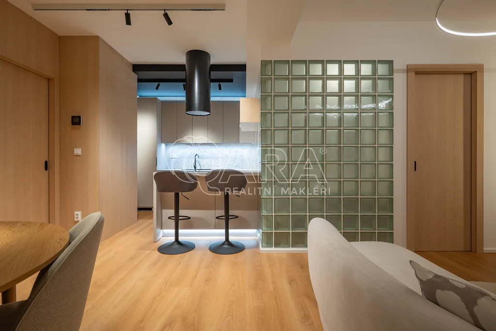 Kuchyňská linka je vyrobena na míru a vybavena všemi potřebnými spotřebiči – elektrickou troubou, indukční varnou deskou, digestoří, myčkou a lednicí. Součástí kuchyně je i barový pult s barovými židlemi, který plynule navazuje na obývací část. Obývací pokoj je zařízen sedací soupravou, kobercem, jídelním stolem se židlemi a obývací stěnou s integrovaným LED osvětlením. To vše doplněno o stylové luxfery.