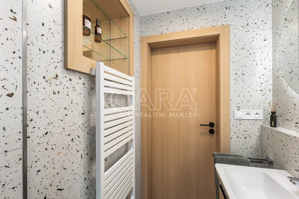 Koupelna je vybavena prostorným sprchovým koutem, se sprchovým deštěm. Dále zrcadlem s led osvětlením a dalším vestavěným koupelnovým nábytkem. Samostatné WC navazuje na design koupelny, je doplněno luxfery a hygienickou sprškou. Technická místnost nabízí vývod na pračku a další úložný prostor.