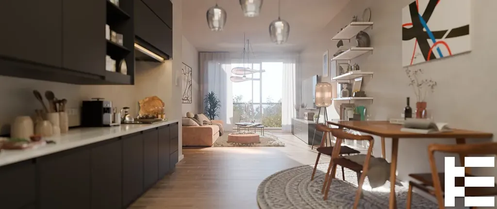 Bytová jednotka se nachází ve 4. nadzemním podlaží a nabízí dispozici 2+kk s celkovou plochou 69,54 m². Vyniká vysokými stropy, které podtrhují vzdušnost prostoru a velkoformátovými okny, jež propouštějí maximum denního světla.