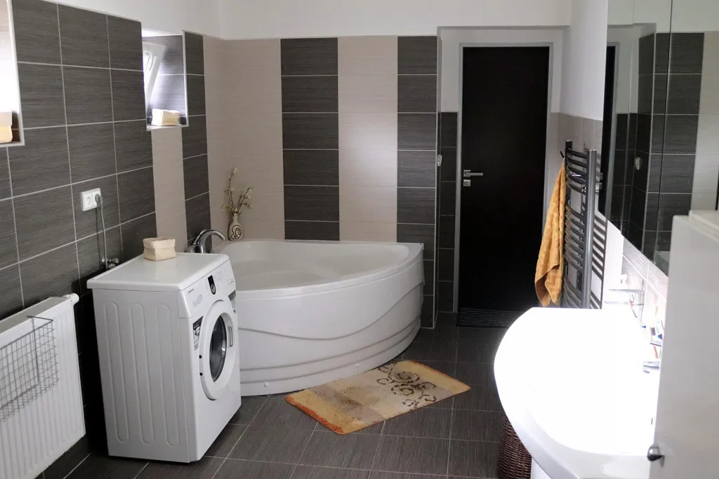 plnohodnotná koupelna se sprchovým koutem a toaletou