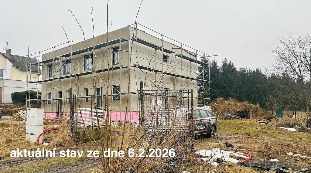 Dům je aktuálně ve výstavbě – stavební povolení vydáno 30.7.2025, plánovaný termín dokončení květen – červen 2026. Průkaz energetické náročnosti budov / PENB – mimořádně úsporná třída B.