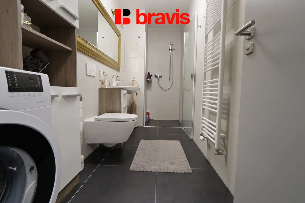 Koupelna je vybavena sprchovým koutem, umyvadlem se skříňkou, zrcadlem s osvětlením a úložným prostorem, otopným žebříkem, toaletou a pračkou.