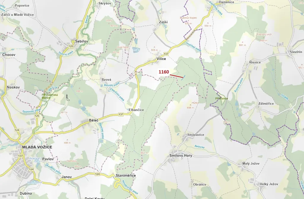 Lesní pozemek o výměře 2693 m2, parcelní číslo 1160, podíl 1/1, katastrální území Vilice, obec Vilice, obec s rozšířenou působností Tábor, okres Tábor, Jihočeský kraj. Po těžbě.