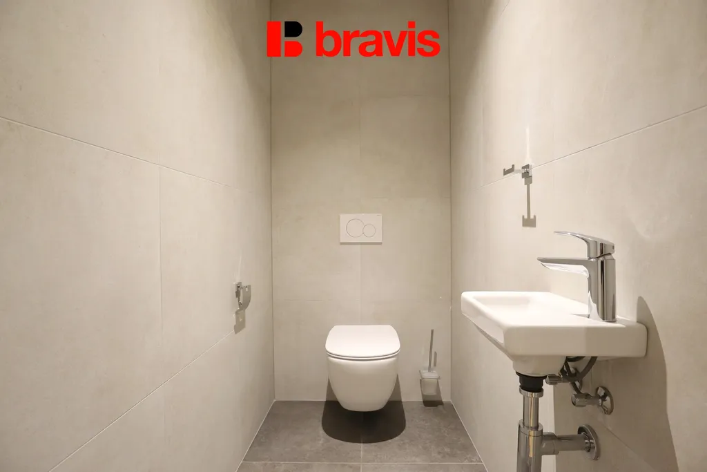 Koupelna o velikosti 4 m² je vybavena umyvadlem, sprchovým koutem a přípojkou na pračku. Samostatná toaleta (2 m²) s umyvadlem zajišťuje vyšší komfort bydlení.