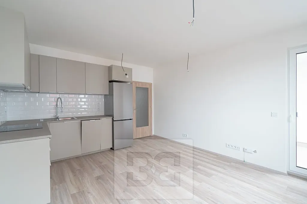 Byt je nabízen nevybavený – k dispozici je pouze kuchyňská linka se spotřebiči (trouba, indukční varná deska, myčka, lednice s mrazákem a digestoř s odtahem). V celém interiéru je položena kvalitní podlaha.