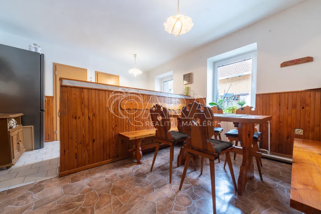 - kuchyň s jídelnou (špajs), prostorný obývací pokoj s krbovými kamny, koupelna s vanou i sprchovým koutem, samostatné WC (tech. místnost), 2 pokoje. Topení plynový kotel, krbová kamna, plastová okna, voda obecní.