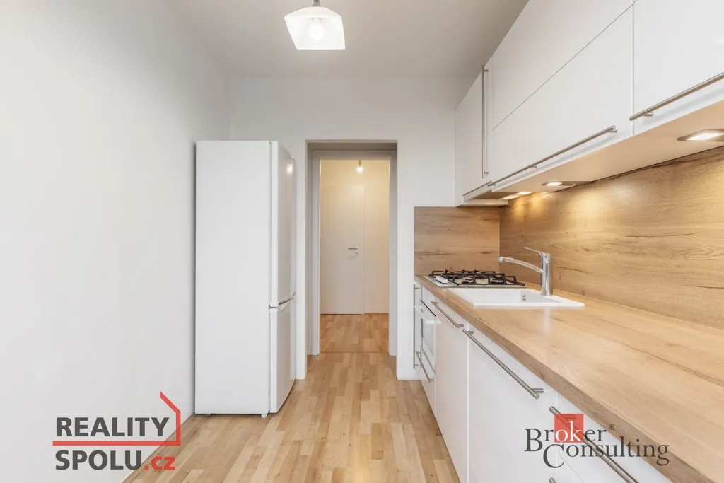 Kuchyňská linka je vyrobena na míru a vybavena vestavěnou myčkou, troubou a plynovou varnou deskou. Praktickým benefitem je samostatná spíž na chodbě, která nabízí dostatek úložného prostoru. Další úložné možnosti zajišťuje vestavěná skříň v ložnici.