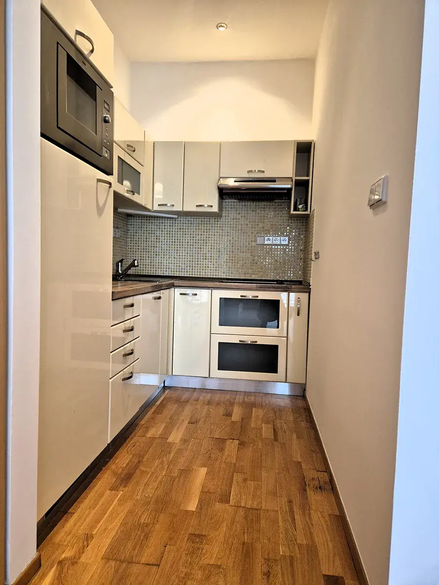 Zařízení v bytě: kuchyňská linka s vestavěnou lednicí a mrazákem, elektrická dvoj plotýnka, digestoř a mikrovlnná trouba.