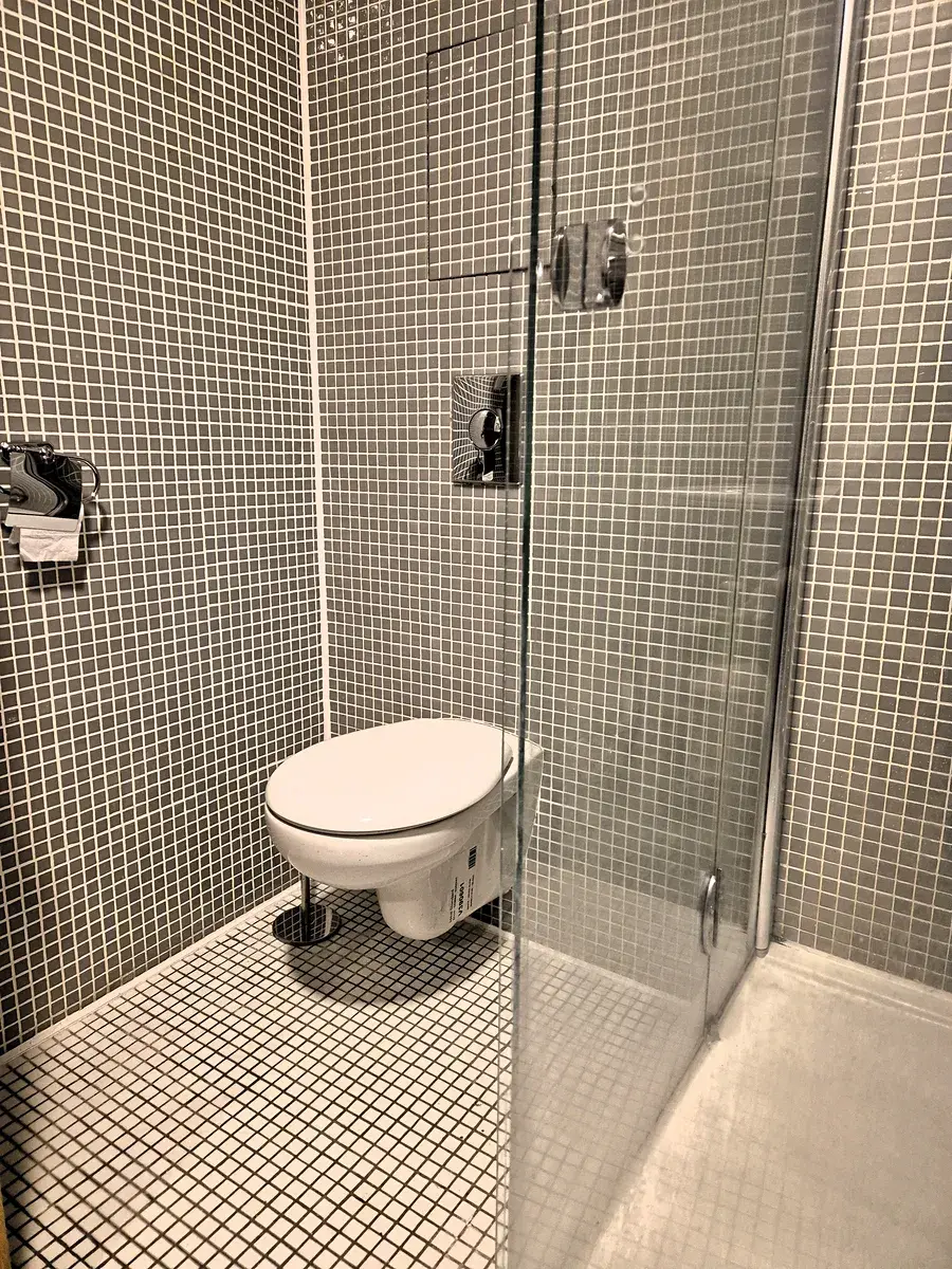 Koupelna se sprchovým koutem a pračka s horním plněním prádla.