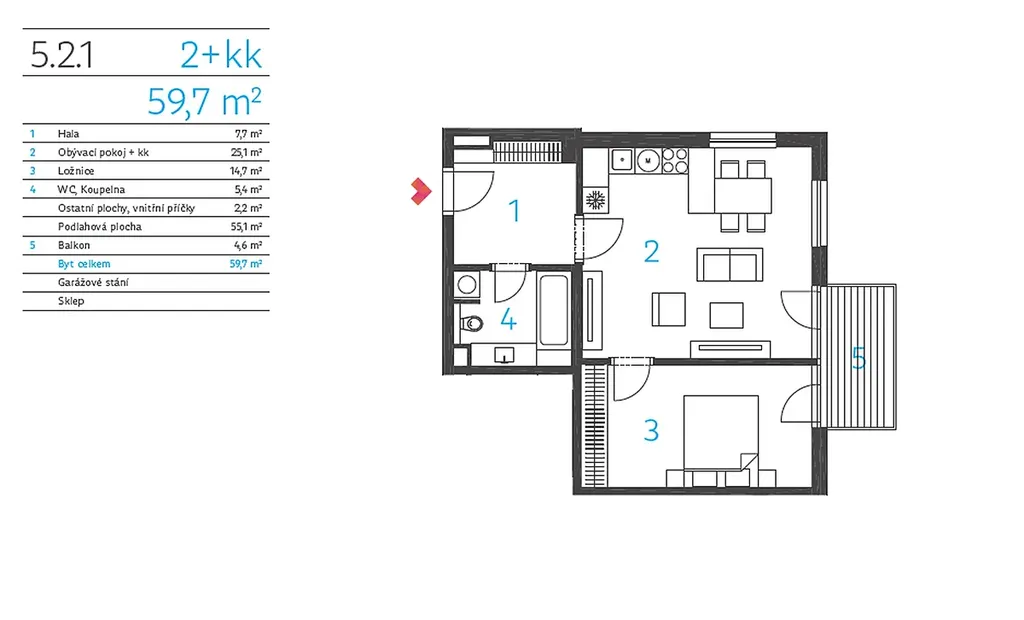 Velká vstupní hala s vestavěnou skříní, koupelna s vanou a toaletou, prostorný světlý obývací pokoj s kuchyňským koutem s lednicí a myčkou s východem na balkon, ložnice s vestavěnou skříní.