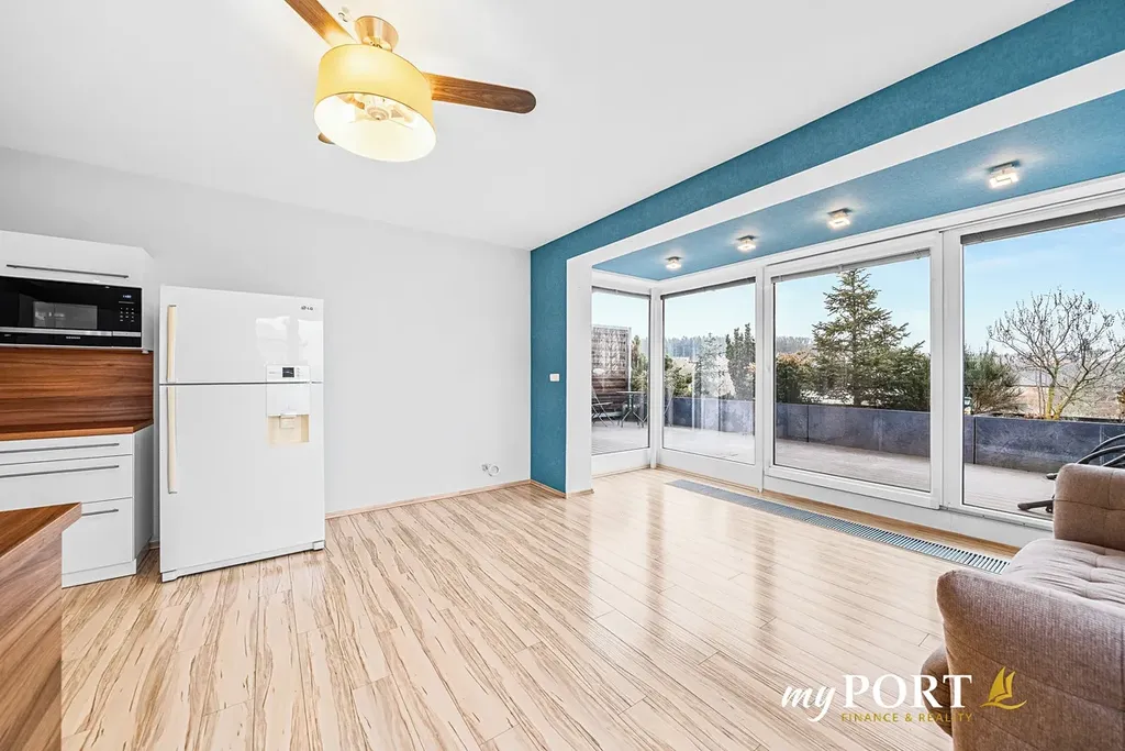 • Obývací pokoj s kuchyňským koutem a s přístupem na terasu. Kuchyňská linka s praktickým ostrůvkem je vybavena spotřebiči Siemens: myčkou, troubou, parní troubou, mikrovlnou troubou, a lednicí LG.