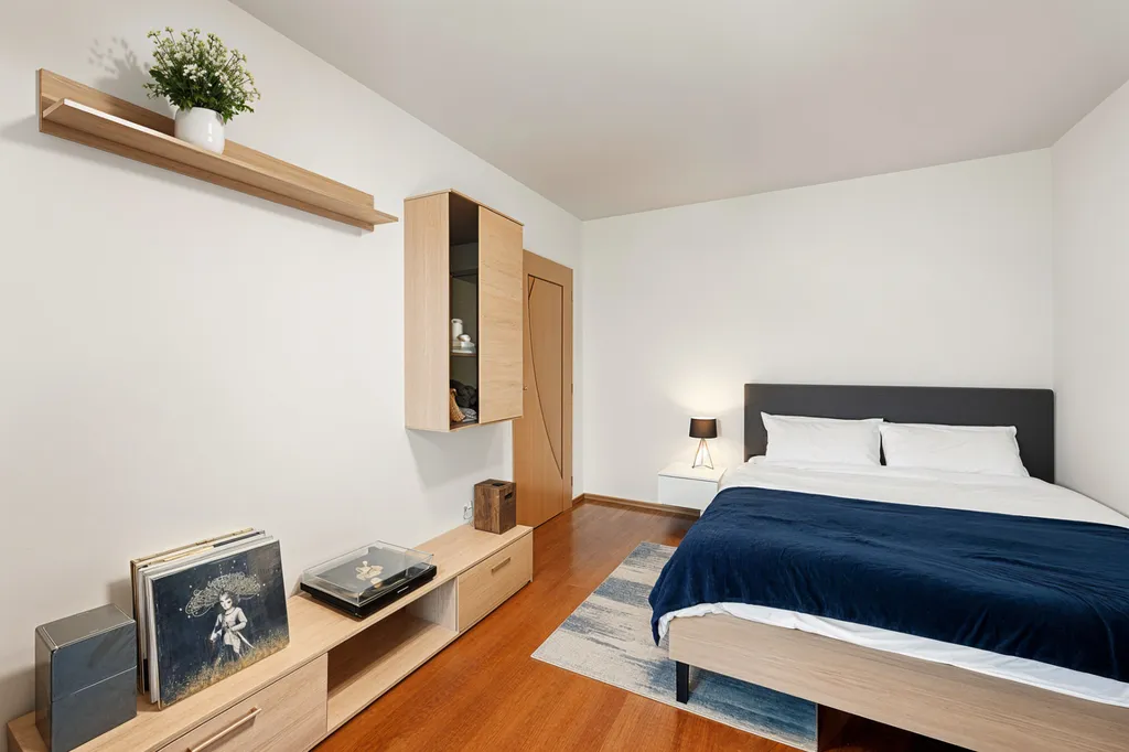 Kuchyňská linka disponuje lednicí, elektrickou troubou, sporákem, digestoří a myčkou. V kuchyni se nachází také jídelní stůl se židlemi. Součástí obývacího pokoje je konferenční stolek a obývací stěna. V dalším pokoji najdeme pracovní stůl s židlí a komodu. Ložnice je zařízena postelí a šatní skříní. V koupelně se nachází vana, umyvadlo a pračka. Toaleta je oddělená. Předsíň je vybavena botníkem a prostornou šatní skříní.