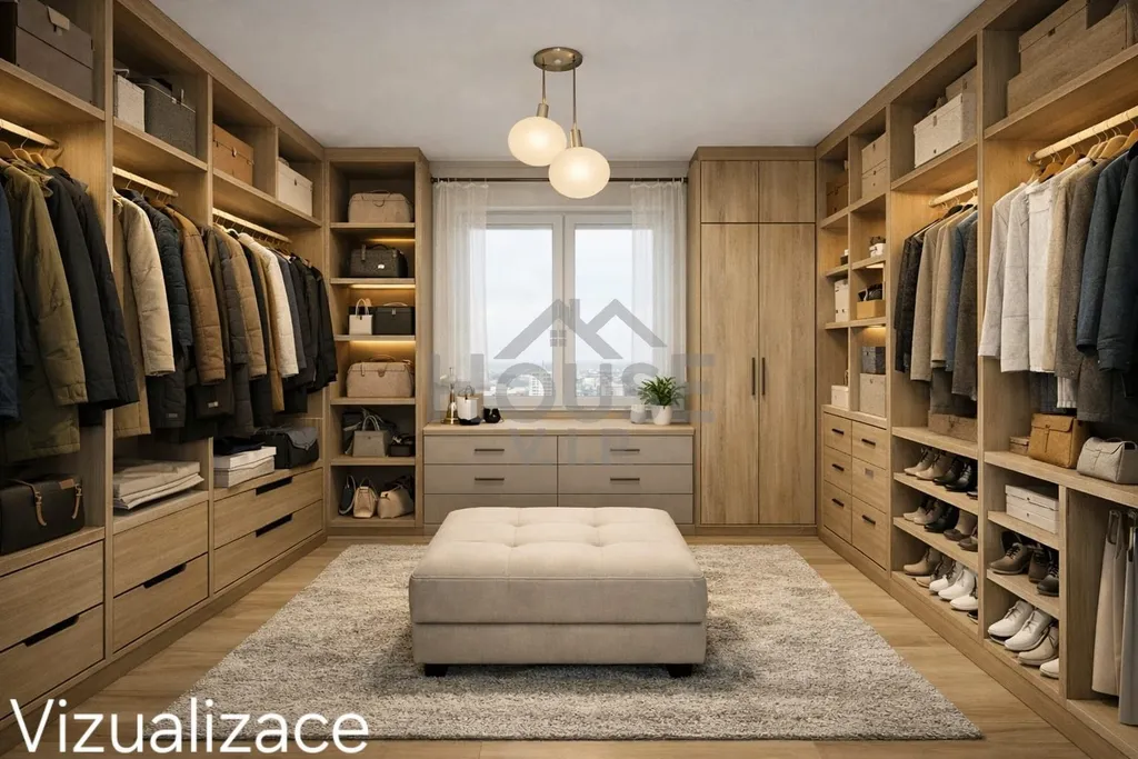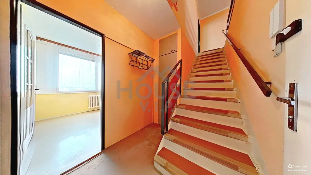 Byt je řešen jako dvoupodlažní, což přináší přirozené oddělení denní a klidové části a zároveň vzdušný, otevřený charakter bydlení. Ve vstupním podlaží se nachází samostatný pokoj, vstupní chodba s úložným prostorem (skříň/botník) a schodiště vedoucí do horní části bytu. Dispoziční řešení poskytuje dostatek soukromí pro jednotlivé členy domácnosti a zároveň prostor pro případné úpravy dle individuálních potřeb.