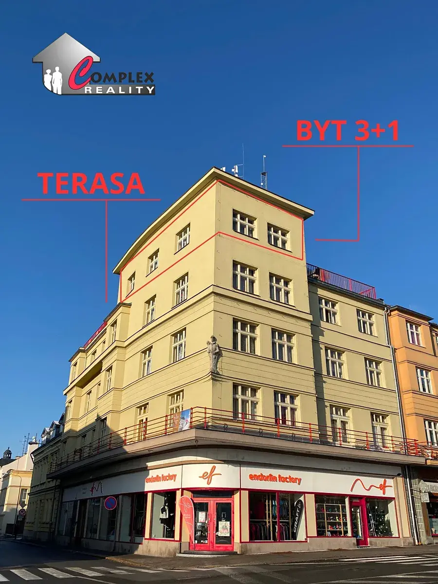 Pronájem slunného bytu o užitné ploše 98 m2 s privátní terasou o velikosti 34 m2. Bytová jednotka se nachází v 5.NP bytového domu Na horním náměstí v ulici 28. Října v Jablonci nad Nisou.