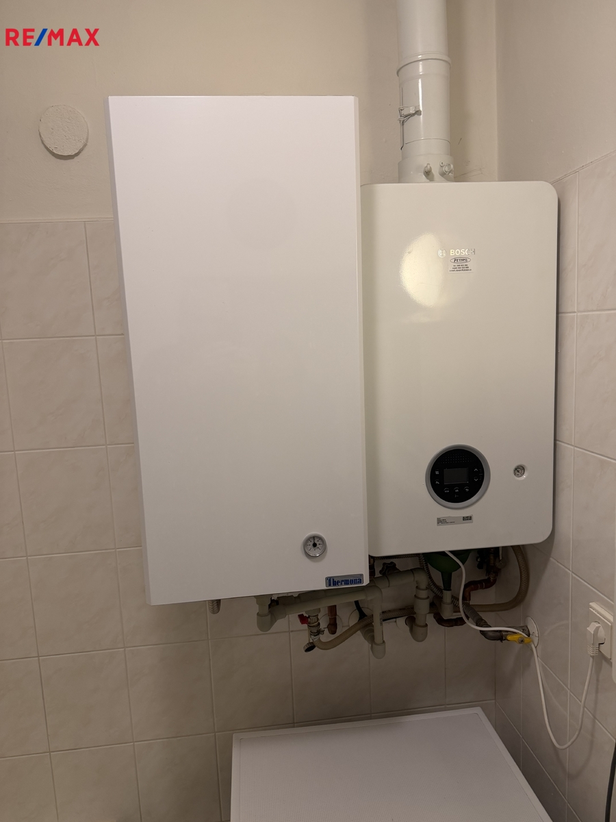 Vytápění a ohřev vody zajišťuje vlastní plynový kondenzační kotel, což přináší úsporný provoz a komfort regulace. Okna jsou orientována na jih a jsou plastová, byt je tedy světlý a příjemně prosluněný, součástí je zděný sklep.