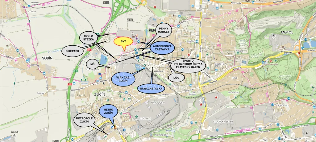 ✔️ V pěší vzdálenosti se nachází autobusová i tramvajová zastávka, obchody a sportovní centrum Řepy s plaveckým bazénem.