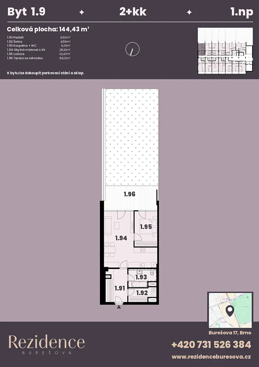 Nabízíme k prodeji moderní byt 2+kk o podlahové ploše 59,30 m2 s terasou 87,20 m2 nacházející se v námi připravovaném projektu Rezidence Burešova v atraktivní lokalitě Veveří. Byt se nachází v 1.NP, orientace bytu do vnitrobloku, jižní strana. K bytu lze koupit parkovací místo v zakladači i sklep.
