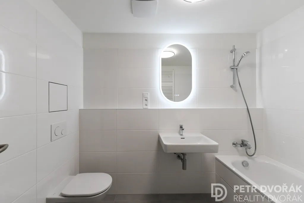 Koupelna je vybavena vanou se sprchovou baterií, umyvadlem, podsvíceným zrcadlem a zavěšenou toaletou. Prostor doplňuje žebříkový radiátor.