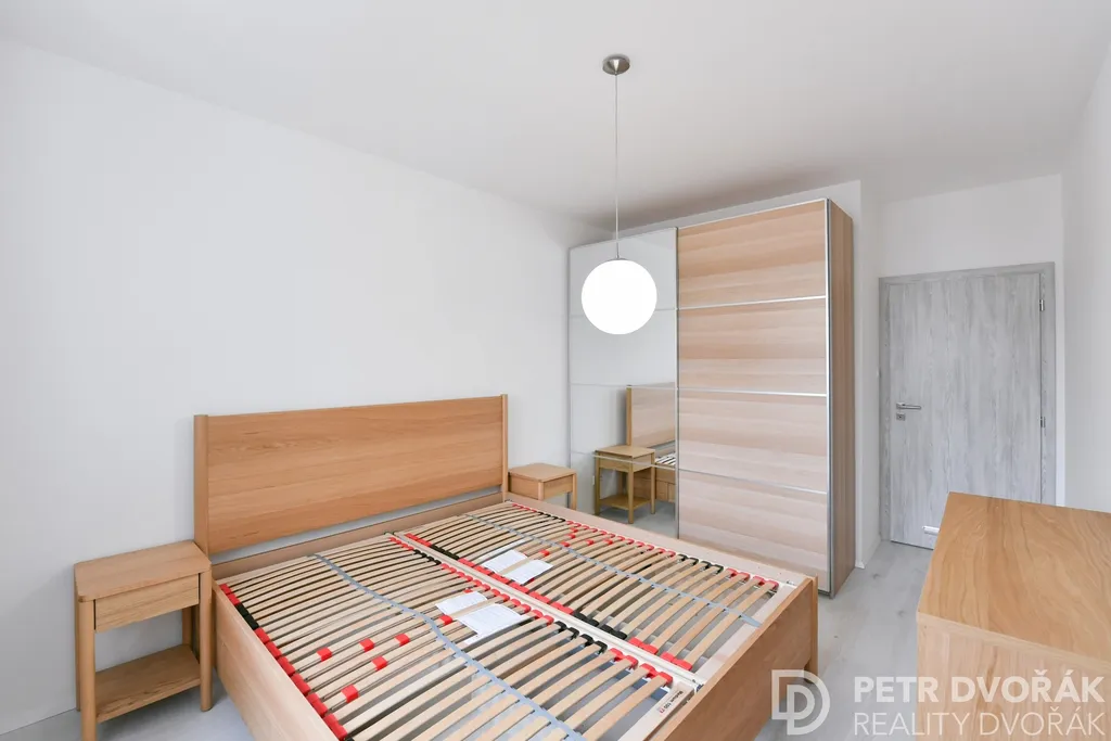 Ložnice disponuje manželskou postelí s lamelovými rošty, dvěma nočními stolky, prostornou šatní skříní s posuvnými dveřmi a zrcadlem a komodou se zásuvkami. Pokoj je světlý díky oknu orientovanému do klidného okolí.