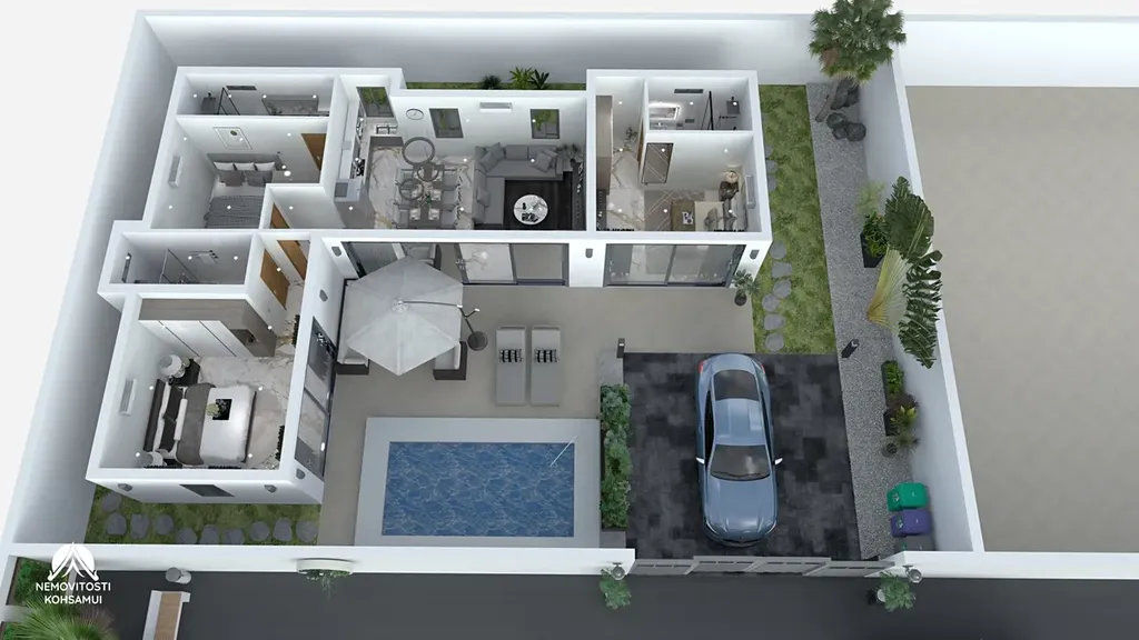 Dům s bazénem se nachází v té nejzelenější části ostrova Taling Ngam a je pouhé 3 minuty od pláže, avšak v okolí se nachází řada služeb a obchodů, včetně restaurace, obchodu Seven Eleven a velkého trhu.