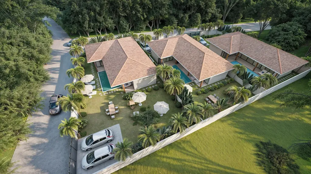 Každá vila se pyšní prostornou plochou 180 m² a disponuje 3 ložnicemi a 3 koupelnami, čímž zaručuje komfortní ubytování pro celou rodinu.