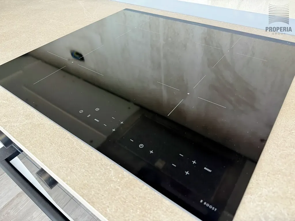 Součástí je kuchyňská linka (její zadní panel bude dokončen v průběhu 02/2026) s vestavěnými spotřebiči - myčka nádobí, indukční varná deska, horkovzdušná trouba, mikrovlnná trouba a velká lednice s mrazničkou - viz přiložená fotodokumentace. Veškeré spotřebiče jsou nové a ještě nepoužité.