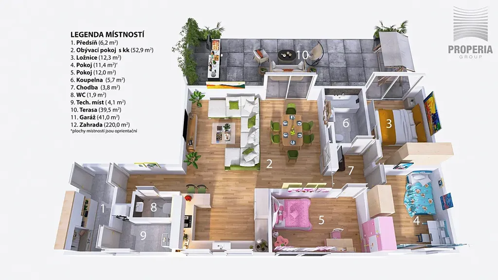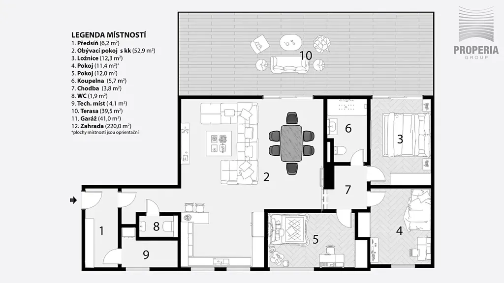 Tento domov je navržen pro ty, kteří hledají prostor, soukromí a harmonii. Přirozeným centrem bytu je velkorysý obývací prostor s plynulým propojením na terasu a soukromou zahradu o velikosti 220 m², která se stává plnohodnotným prodloužením interiéru. Místo pro klidná rána, rodinné chvíle i večery s přáteli.