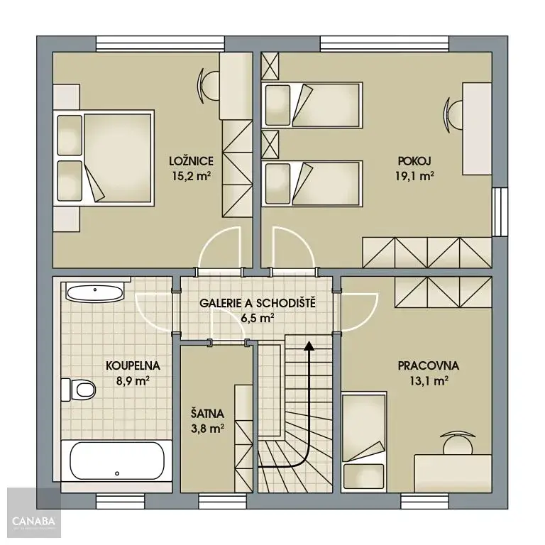 Dominantou přízemí je prostorný obytný prostor s kuchyní a jídelnou, odkud je přímý vstup na zahradu. Součástí tohoto podlaží je také další pokoj, koupelna se sprchovým koutem a WC, místnost vhodná pro hobby či skladování a samostatná komora. V horním patře se nachází ložnice, pokoj, pracovna, velká šatna a koupelna s vanou a toaletou.