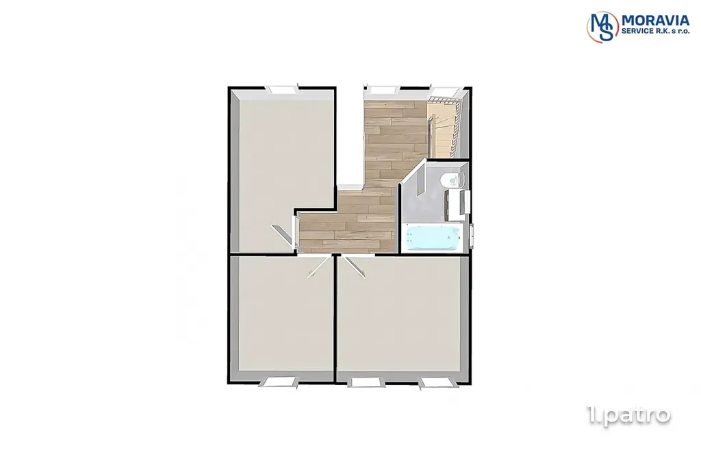 V prvním patře se nachází 3 neprůchozí pokoje a koupelna.