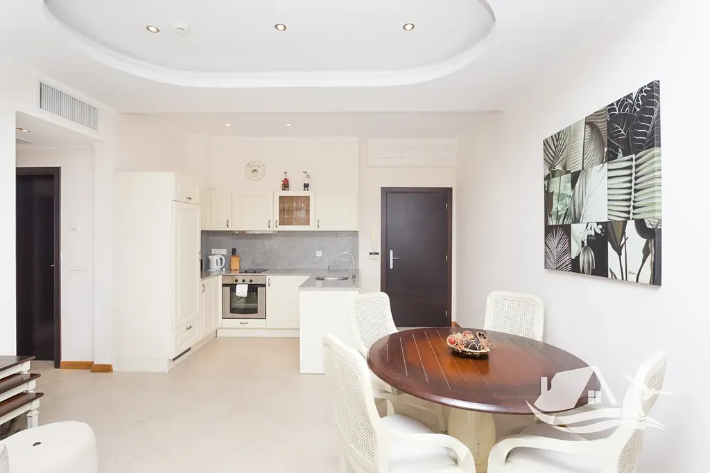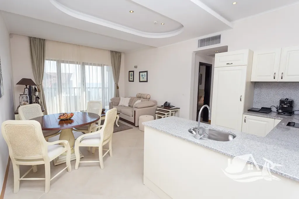 Apartmán 2+kk má celkovou plochu 103,8 - m² a je navržen s důrazem na pohodlí i funkčnost. Dispozice nabízí světlý obývací pokoj s kuchyňským koutem, samostatnou ložnici s vlastní koupelnou a toaletou, další toaletu pro hosty a prostornou terasu s výhledem na moře a golfové hřiště. Prostor působí otevřeně, vzdušně a přirozeně propojuje interiér s okolní krajinou.