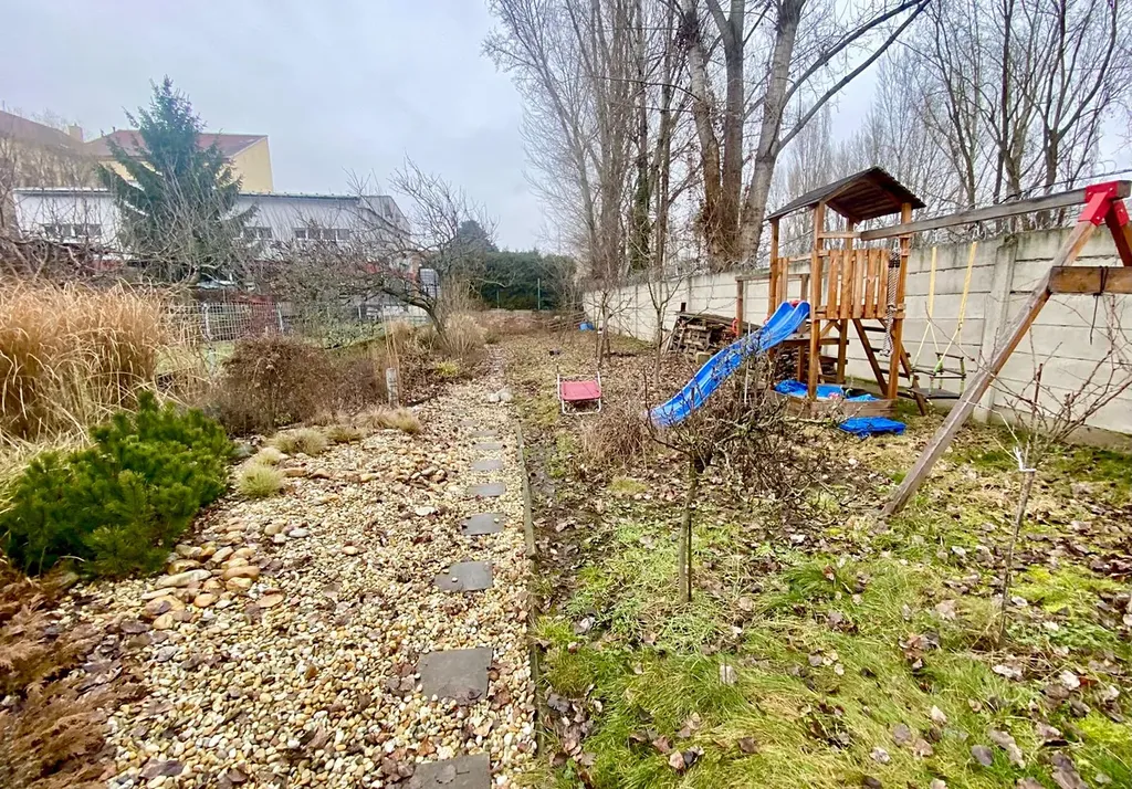 Ve dvoře je společné posezení, terasa, místo pro bazén, a prostorná zahrada se zahradním domkem.