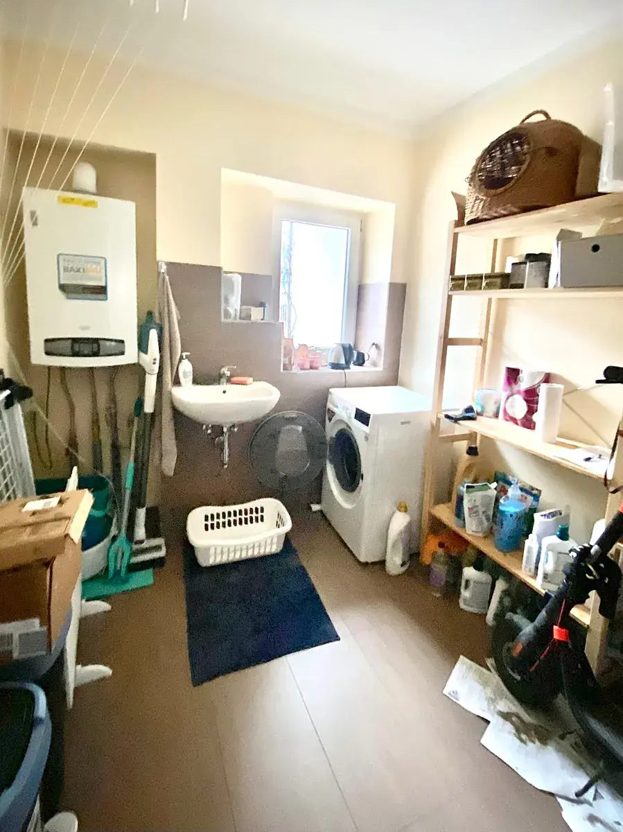 Dům je připojený na všechny inženýrské sítě, vytápěn je plynovým kondenzačním kotlem. V přízemí budovy se nachází vstupní chodba, která spojuje dům a dvorní trakt. Ze vstupní chodby je přístupný byt 2+1 o podlahové ploše 62m2, obytné podkroví 40m2 a technická místnost 5,4m2 (kotel, pračka), garáž 18m2 je využívána jako studio.