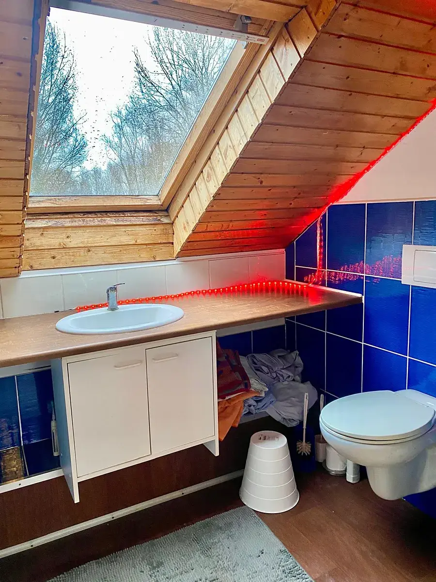 V obytném podkroví se střešními okny 40m2 je koupelna se sprchovým koutem a WC, kuchyňský kout a obytný prostor.