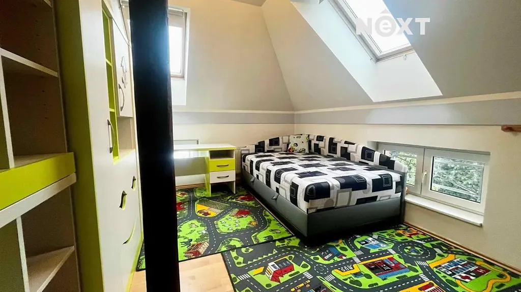 Hlavní obytnou část tvoří kuchyně vybavená spotřebiči, propojená s jídelnou, která plynule navazuje na obývací pokoj. Prostor je řešen otevřeně, nabízí dostatek místa pro běžný provoz domácnosti i posezení. Součástí spodního patra je také samostatný pokoj, vhodný jako dětský pokoj, pracovna nebo pokoj pro hosty.