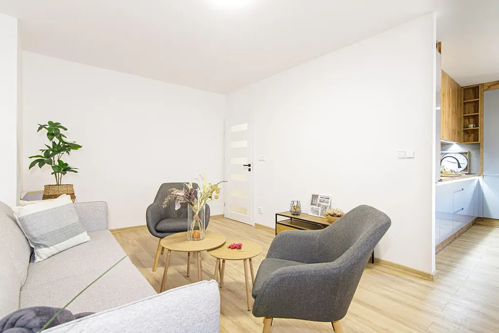 Byt působí velice vzdušným dojmem díky otevřenému prostoru mezi kuchyní a obývacím pokojem.