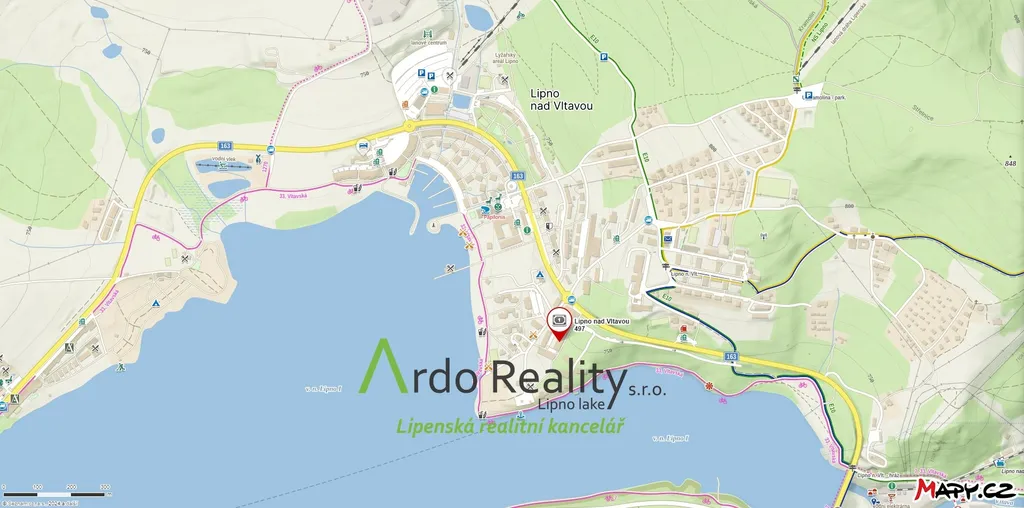 Byt o velikosti 67 m² v areálu DOKY Holiday resort v Lipně nad Vltavou poblíž nádherné pláže a cyklistické stezky, nedaleko aquaparku či skiareálu Lipno. V areálu Doky je k dispozici venkovní vyhřívaný bazén, brouzdaliště pro děti, dětské hřiště a relaxační centrum se saunou. Vlastník apartmánu je spoluvlastníkem těchto prostorů. Areál je plný okrasné zeleně a parkových ploch. Apartmán je v osobním vlastnictví, vhodný pro 4 - 5 osob. Je zde elektrické vytápění a voda se ohřívá bojlerem. Obývací pokoj je plný světla z prostorné terasy o velikosti 7 m². Součástí obývajícího pokoje je kuchyňský kout se sklokeramickou deskou, barovým pultem, elektrickou troubou, mikrovlnnou troubou, myčkou na nádobí a lednicí s mrazákem. Další místností je ložnice s manželským dvojlůžkem a vestavěnou skříní. V prostorné koupelně najdete vanu s umyvadlem a pračku. Byt má dále oddělené WC s malým umyvadlem. Poslední místností je sklep pro odložení lyží, jízdních kol a jiného materiálu. Byt je kompletně vybaven a připraven na pronajímání. K nemovitosti patří vlastní parkovací stání. K nejbližší restauraci 116 metrů, na pláž 350 metrů, skiareál Lipno je vzdálen 1 km. Stezka korunami stromů je pěšky vzdálena jen 2,7 km. Lázeňský městys Frymburk je vzdálen 8,6 km.