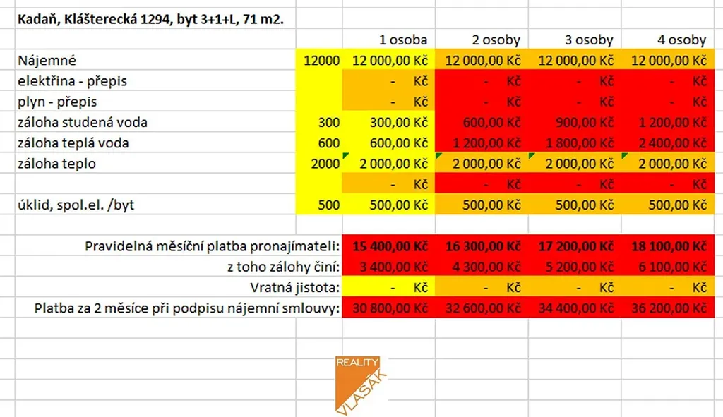 Byt 3+1+lodžie je situován v 7. patře panelové výškové budovy, která se nachází v Kadani, ulice Klášterecká. Osobní vlastnictví, podlahová plocha bytu činí 71,00 m2 s dispozicí: 3x pokoj, kuchyň, koupelna, WC, předsíň, lodžie a sklep. Byt je udržovaný bez zásadní rekonstrukce. Z každého pokoje i kuchyně je panoramatický výhled na Kadaň a Doupovské hory. Kuchyňská linka s plynovým sporákem, plastová okna, budova je zateplena, kabelová TV+internet (není zahrnuto v ceně). Celková měsíční platba se skládá z nájemného plus zálohy na teplo, T + S vodu, spol.el.,(teplo 2.000,- Kč/byt/měs. T+S voda 900,-Kč/osoba/měs., elektřina a plyn přepis na nájemníka, úklid+spol.el. cca 500,-Kč/byt/měs..) Požadována platba 2 měsíce předem (nájem plus zálohy), bez vratné jistoty. Podrobná tabulka plateb viz fotografie k nabídce.