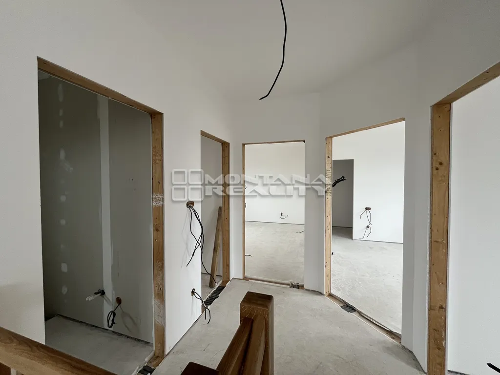 Nabízíme k prodeji nízkoenergetickou novostavbu rodinného domu ve Velkém Týnci u Olomouce. Dům je velmi velkoryse řešen jako 5+kk s technickou místností. Parkování pod přístřeškem před domem pro 2 auta a dalším místem na parkování. Přízemí je dispozičně řešené se zádveřím a vstupní chodbou, koupelnou s WC, pokojem. Hlavní obytný pokoj se vstupem přes prosklený portál na terasu a zahradu. Kuchyňská část s praktickou komorou, navazující na masivní dřevěné schodiště do patra. V prvním patře 3 samostatné pokoje a komora se šatnou. Dále pak v patře koupelna s možností umístění vany a sprchového koutu a toaletou. Dům disponuje velmi příjemným podlahovým topením, s ovládáním přes tepelné čerpadlo. Fasáda je s designových panelů a kombinací dřeva. Okna jsou plastová šesti komorová s trojskly včetně vstupních dveří. Nemovitost je ve vysokém standartu, s kvalitní stavební technologií, dále má nachystanou přípravu na venkovní žaluzie, klimatizaci, zabezpečovací systém. Celková užitná plocha domu činí 148 m2, dále pak zastřešené venkovní stání o výměře 30 m2, s pozemkem o celkové výměře 502 m2. Velkou výhodou je umístění domu, jedná se o rohový dům na ulici Podštampilí a Leopolda Prečana ve Velkém Týnci. Nemovitost je nyní nachystaná s možností dokončení podlahových krytin, obložek s dveřmi a koupelen, není zahrnuto v ceně. Pro klienty, kteří hledají prostorné bydlení s výbornou dostupností do města. Prohlídky dle dohody, více informací u realitního makléře Ondřeje Rudolfa.
