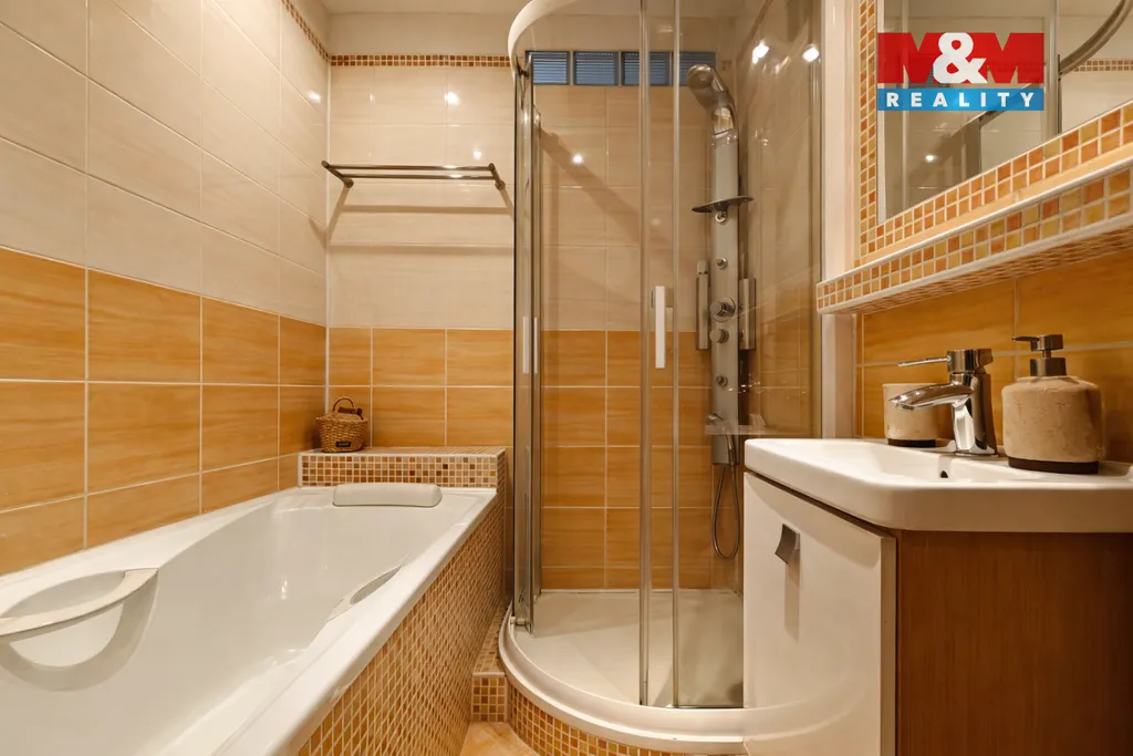 Vyzděné jádro: koupelna s vanou, sprchou a vyhřívanou podlahou.